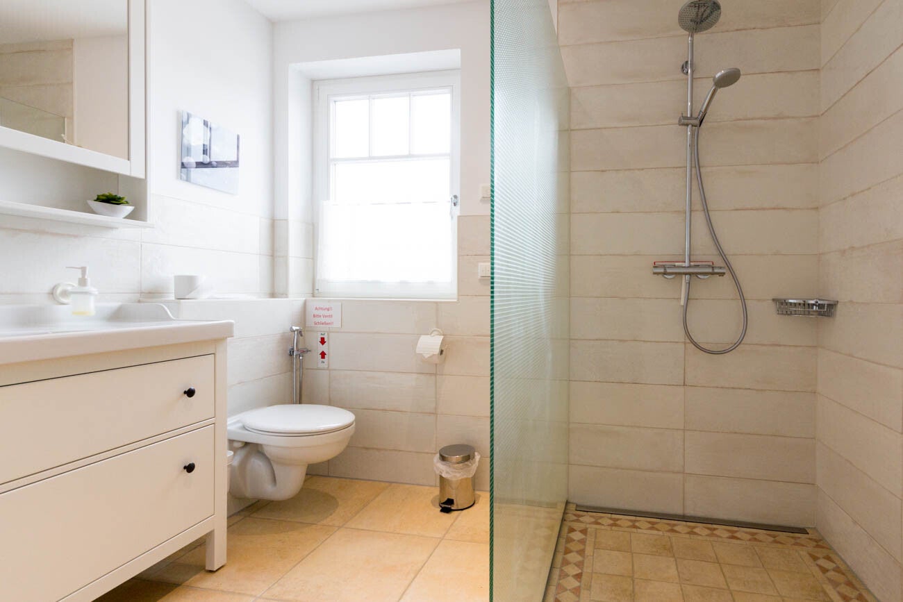 Das Badezimmer im Obergeschoss bietet die gleiche hochwertige Ausstattung wie sein Pendant im Untergeschoss. Es verfügt über ein Urinal, eine hygienische Dusche, einen stilvollen Waschtisch im Landhausstil und eine geräumige, komfortable Dusche. Diese durchdachte Gestaltung sorgt für ein angenehmes Nutzungserlebnis und erfüllt alle Ansprüche der Nutzer. Egal, ob Sie einen kurzen Besuch oder eine entspannende Auszeit planen, unsere Badezimmer garantieren Ihnen hygienische Standards und praktische Funktionalität. Qualität und ansprechendes Design stehen an erster Stelle, damit Sie sich in Ihrem Badezimmer rundum wohlfühlen.
