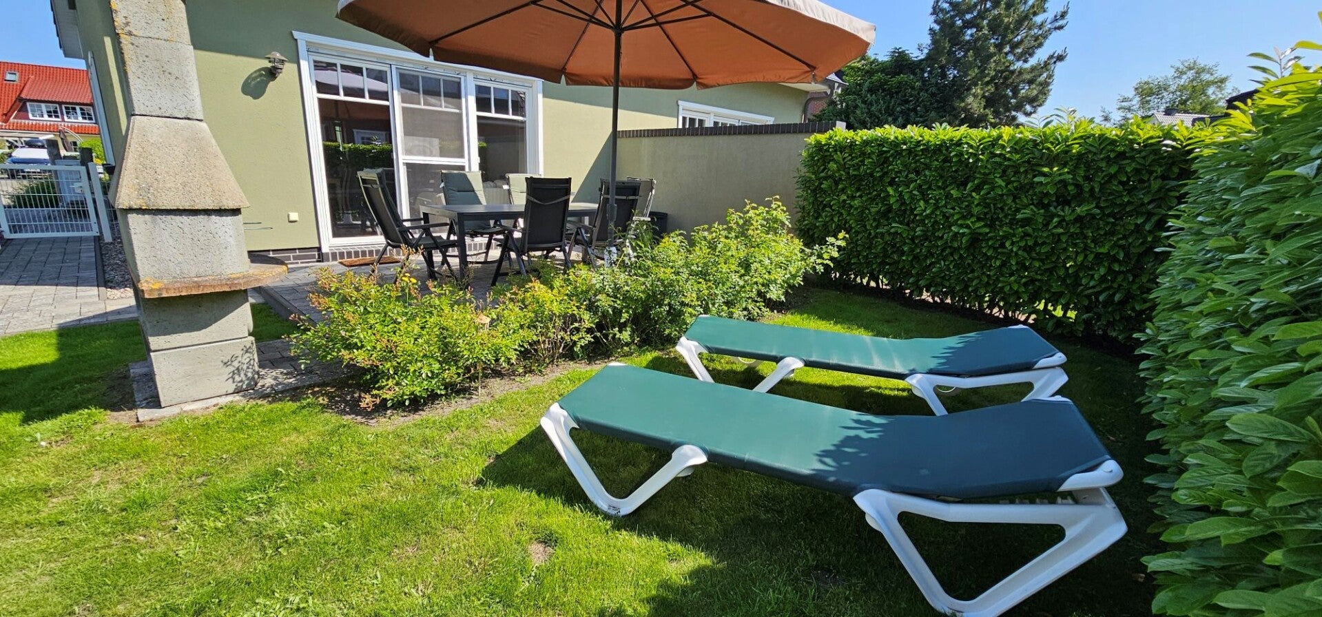 Der Garten ist komplett mit einer schönen Hecke eingefriedet, die nicht nur für Privatsphäre sorgt, sondern auch einen tollen ästhetischen Rahmen bietet. Im Zentrum steht ein großer Sonnenschirm, der an heißen Tagen für Schatten sorgt und Ihnen die Möglichkeit gibt, ganz entspannt im Freien zu relaxen. Ergänzend dazu haben Sie einen Grill, ideal für gesellige Abende mit Freunden oder Familie, wo Sie köstliche Grillgerichte zubereiten können. Professionelle Liegen laden zum Entspannen und Sonnenbaden ein, während die Gartenmöbel bequem und stilvoll für weitere Sitzmöglichkeiten sorgen. Dieser Garten ist der perfekte Ort, um die Seele baumeln zu lassen und die Natur in vollen Zügen zu genießen.