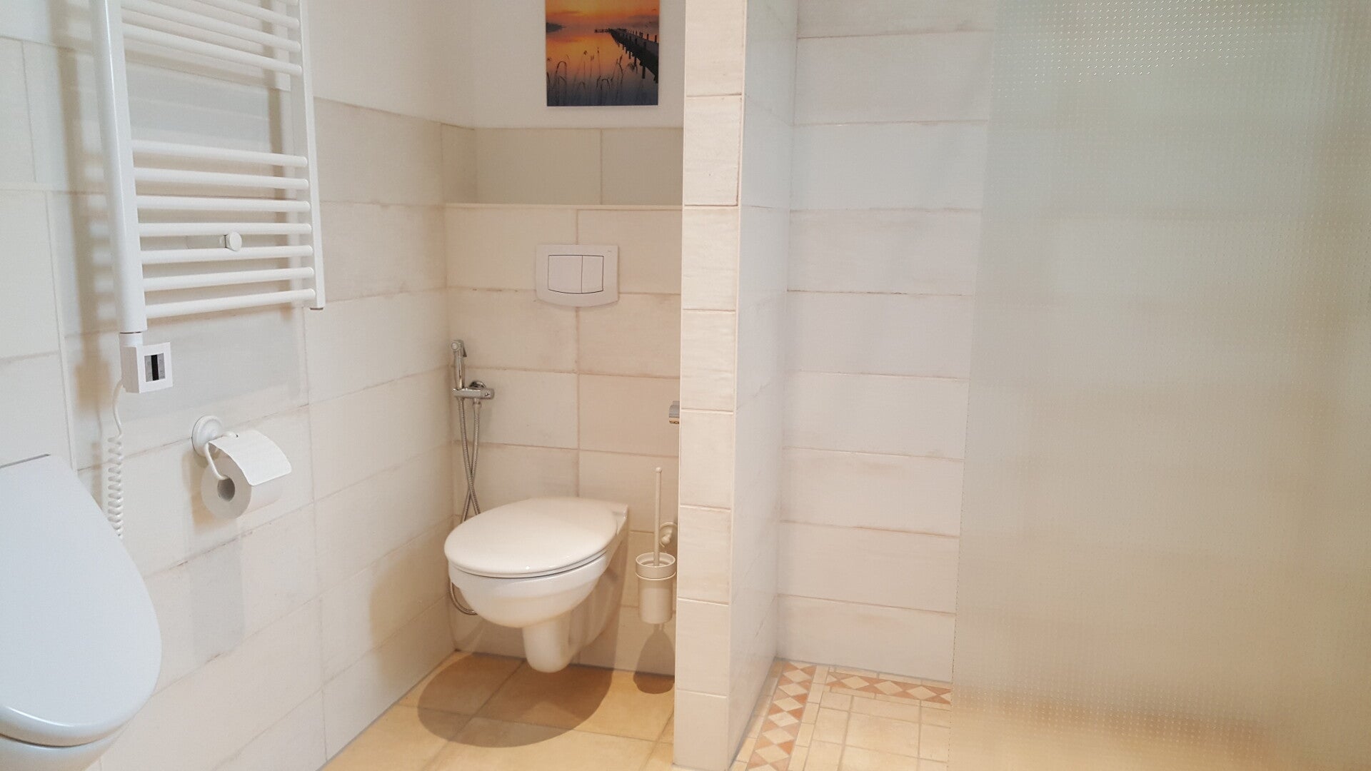 Das Badezimmer ist mit einer großzügigen Dusche, einem praktischen Urinal sowie einer hygienischen Dusche ausgestattet, ergänzt durch einen stilvollen Waschtisch im Landhausstil. Diese modernen Einrichtungen vereinen Komfort und Funktionalität. Die Dusche bietet ein erfrischendes Duscherlebnis, während das Urinal eine platzsparende Lösung für Männer bereitstellt. Die hygienische Dusche fördert zusätzliche Sauberkeit und trägt zur allgemeinen Hygiene bei. Mit diesen durchdachten Elementen verwandelt sich Ihr Badezimmer in eine Oase der Entspannung und Erfrischung.